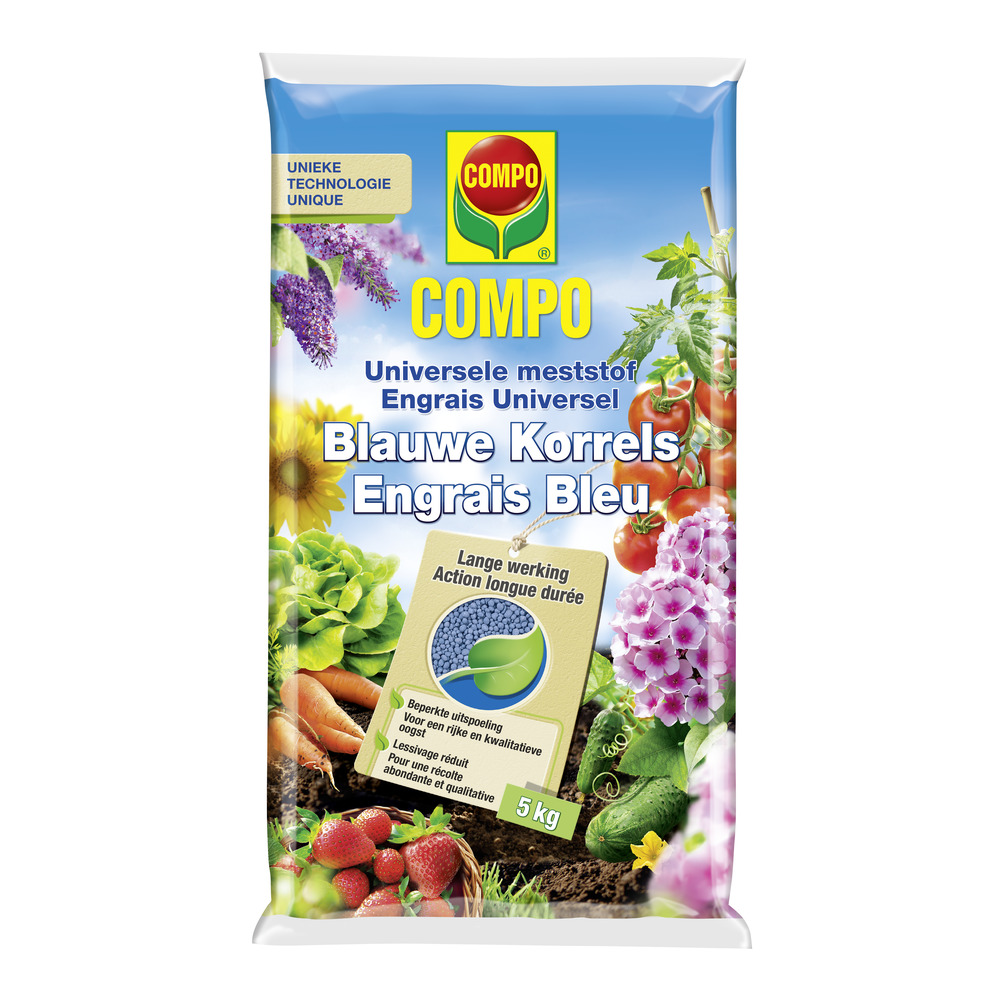 COMPO Universele Meststof Blauwe Korrels is een hoogwaardige meststof voor de bemesting van de gehele moes- en siertuin. Elke korrel bevat alle vereiste voedings- en sporenelementen voor stevige planten en een hogere opbrengst in de moestuin. De nitritificatieremmer zorgt voor een geleidelijke vrijgave van nitraatstikstof in de bodem volgens de noden van de plant. Zo worden je planten optimaal van voedingsstoffen voorzien en wordt de stikstofuitspoeling in het grondwater beperkt.