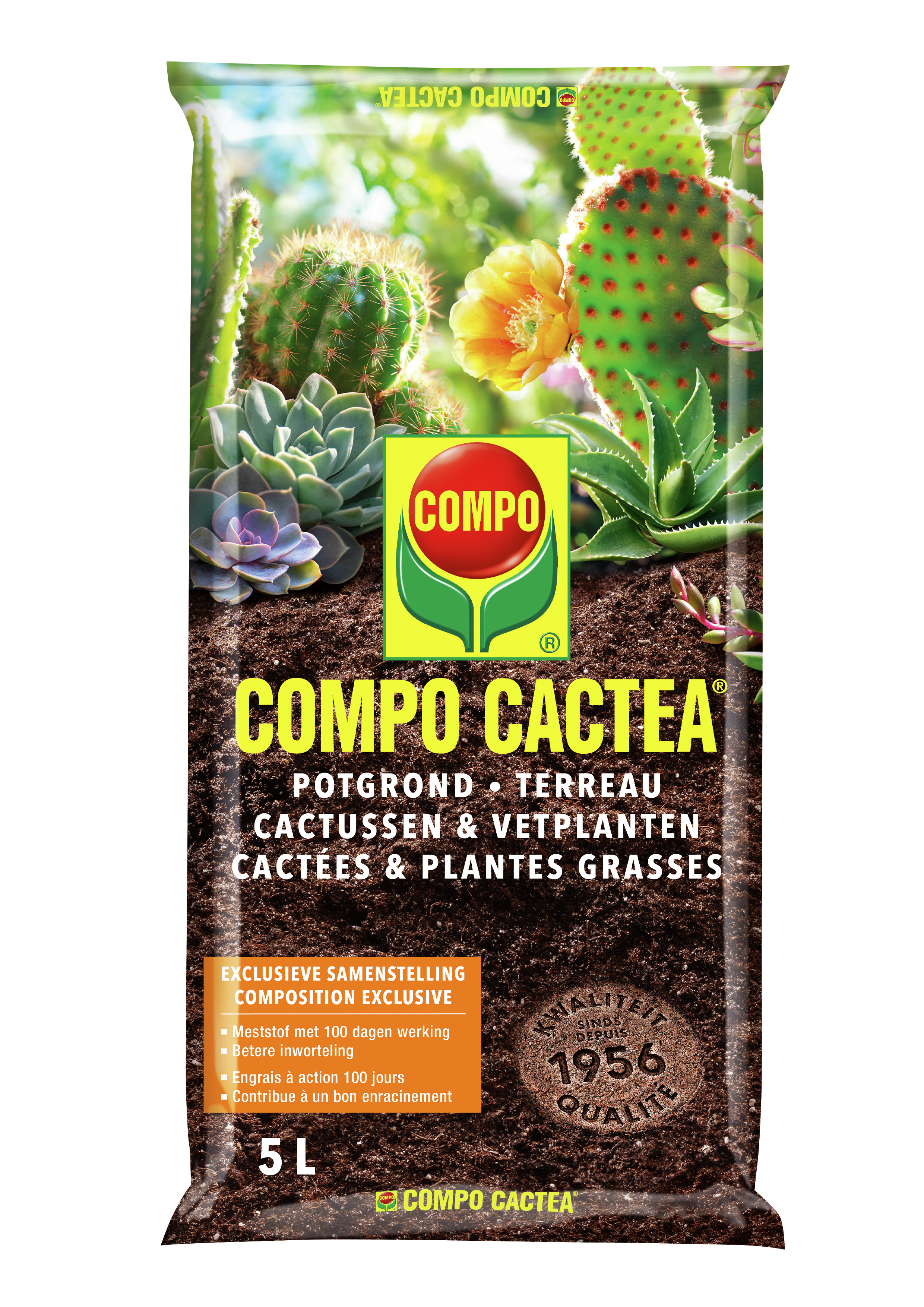 COMPO SANA Potgrond Cactussen & Vetplanten is geschikt voor alle soorten cactussen en vetplanten. Het product verzekert een goede plantenontwikkeling, een stevig wortelgestel en een uitgebalanceerde voeding. Het substraat is verrijkt met een meststof met directe en langdurige werking tot 100 dagen. Hoogwaardig kwartszand zorgt voor een goede herbevochtiging en wateropname van de potgrond.