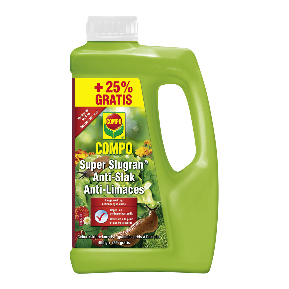 COMPO Super Slugran is een minikorrel voor de bestrijding van diverse slakken in groenten, fruit en bloemen (zowel in open lucht als onder glas). De actieve stof metaldehyde is regenbestendig en beschimmelt niet. Het product heeft een sterke lokwerking en een hoge opname door de aantrekkelijke samenstelling. Het is bovendien veilig voor egels en andere nuttige organismen.