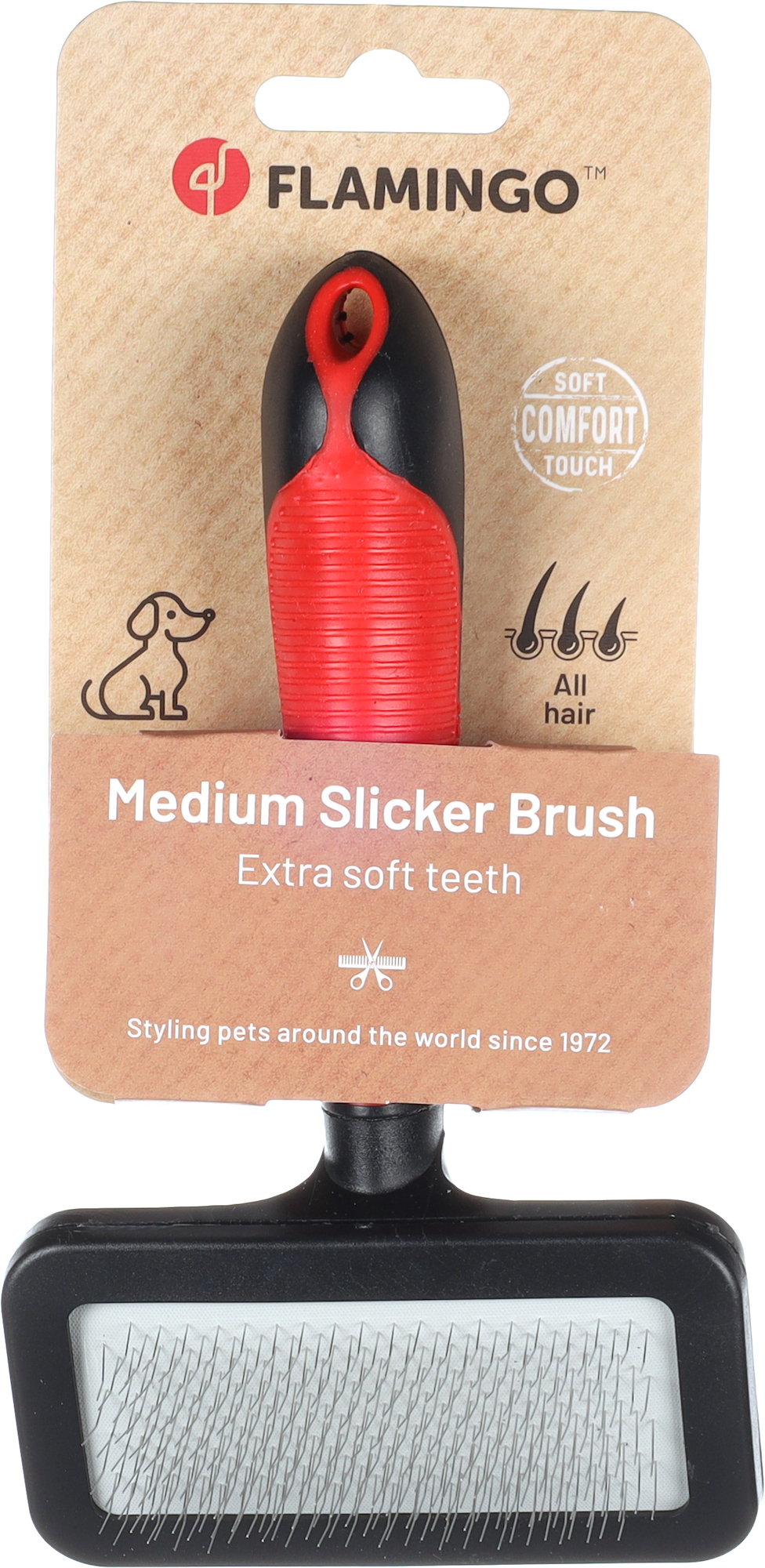 Cette brosse universelle en plastique avec des broches extra douces assure un meilleur soin du pelage grâce aux dents flexibles qui aident à démêler les nœuds et à enlever les poils.